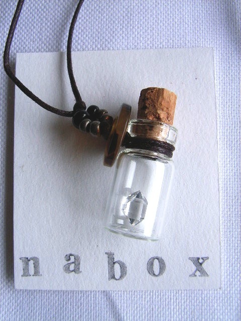 原石のままで、キラキラと無垢な輝きを放つ水晶ハーキマーダイヤモンド。 どんなに小粒でも、ビーズのように穴をあけてしまうのはかわいそうなので、 いつもワイヤーで包むようにしてアクセサリーに仕立てています。 最近、小さなびんを売っているのを見つけたので、 中にひと粒入れて、ペンダントにしてみました。 いつでも、そのままの姿を手に取ってみることができますよ。 …………………………………………………………… 素材:ハーキマーダイヤモンド 8mm(AAA orAA++グレード) ガラスびん コルク栓(リサイクル素材) ボタン ガラスビーズ ワックスコード トップの大きさ:約3cm×2.5cm(びんの高さ2.5cm 直径1.3cm) ひもの全周:約68cm …………………………………………………………… |