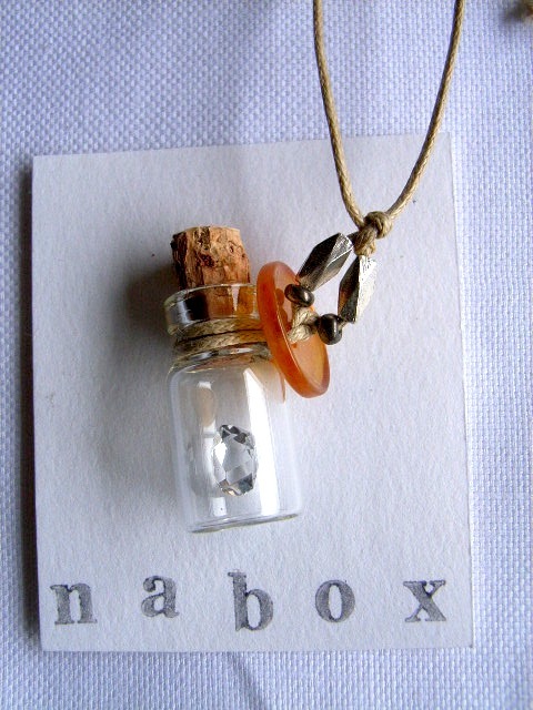 原石のままで、キラキラと無垢な輝きを放つ水晶ハーキマーダイヤモンド。 どんなに小粒でも、ビーズのように穴をあけてしまうのはかわいそうなので、 いつもワイヤーで包むようにしてアクセサリーに仕立てています。 最近、小さなびんを売っているのを見つけたので、 中にひと粒入れて、ペンダントにしてみました。 いつでも、そのままの姿を手に取ってみることができますよ。 …………………………………………………………… 素材:ハーキマーダイヤモンド 8mm(AAA orAA++グレード) ガラスびん コルク栓(リサイクル素材) ボタン ガラスビーズ カレンシルバービーズ ワックスコード トップの大きさ:約3cm×2.5cm(びんの高さ2.5cm 直径1.3cm) ひもの全周:約68cm …………………………………………………………… |
