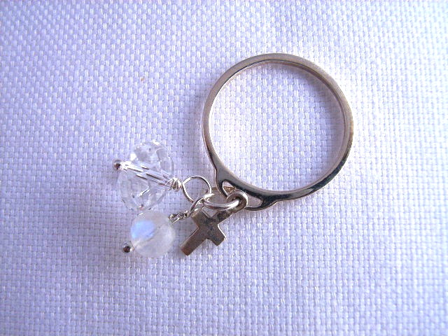 小さなシルバーのクロス、スワロフスキー、ムーンストーンの 3種類のチャームがゆれるリングです。 リングの厚みは細めの1ミリくらい。 サイズは9号ですが、11号または13号に変更できます。 …………………………………………………………… 素材:SV925リング チャーム・パーツ スワロフスキー ムーンストーン 大きさ:全長約3.2cm(チャーム含む) 本体長さ約2.0cm 幅約1.7cm …………………………………………………………… |