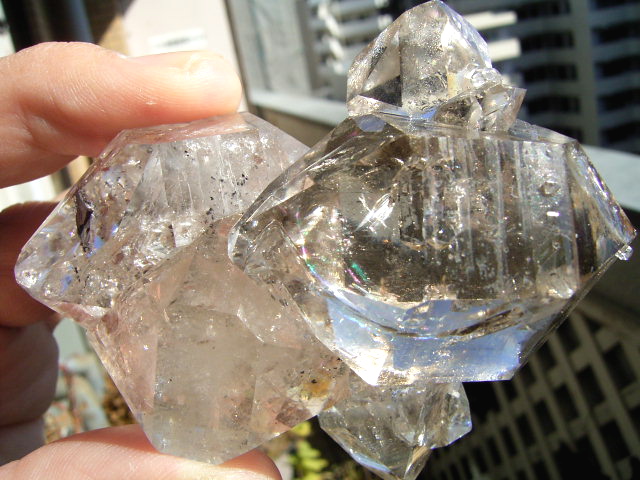少し突き出た30mm+23mmの貫入クリアの結晶内包双晶は、とても面白い形成で、ここにも虹のヴェール。