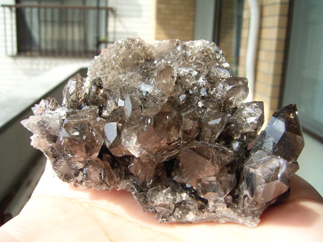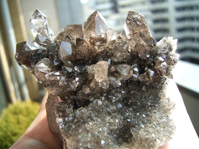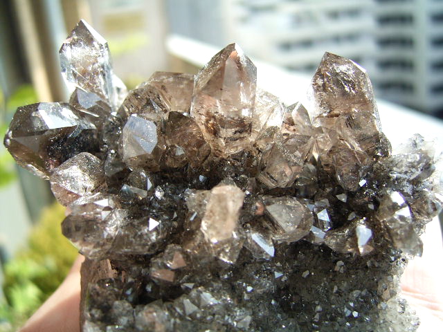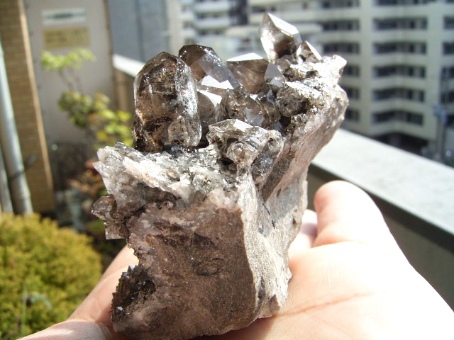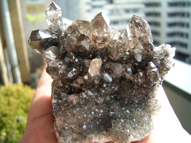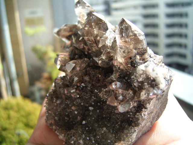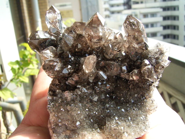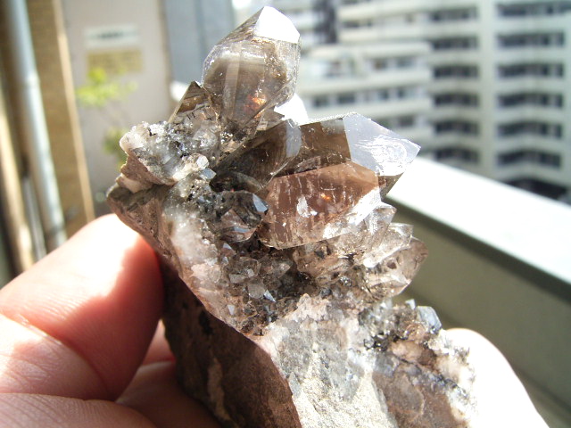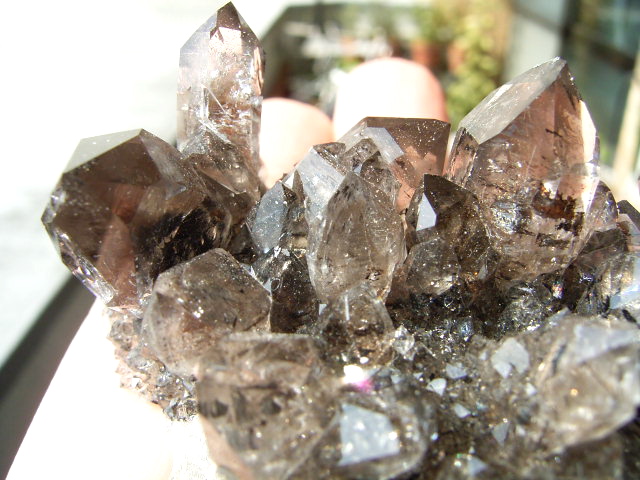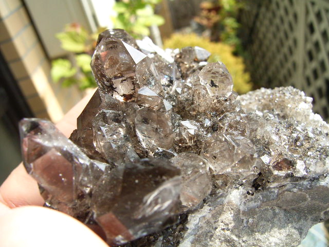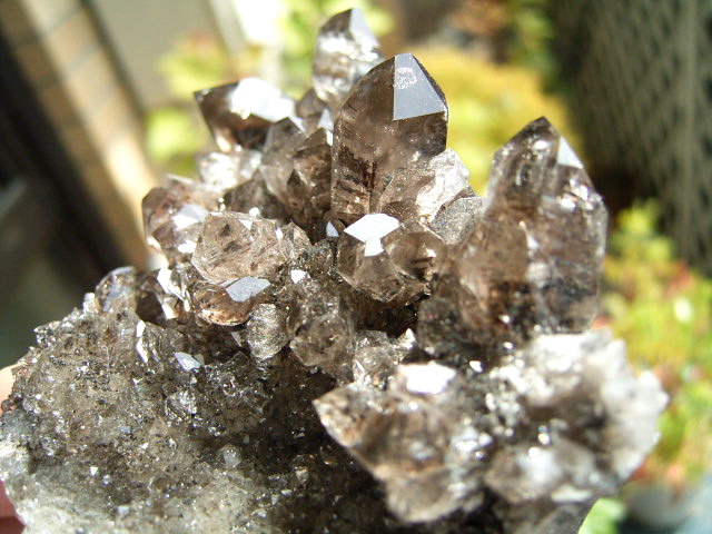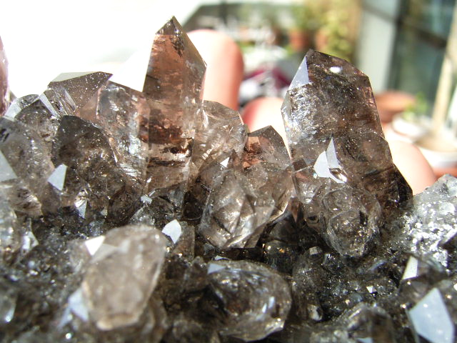 虹の見える大きなファントム結晶、ダークスモークの絡み合った群晶、クリアで小さな幻影の結晶達が、結晶の上に重なり合って形成されています。
