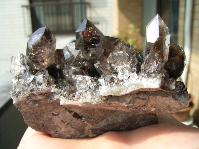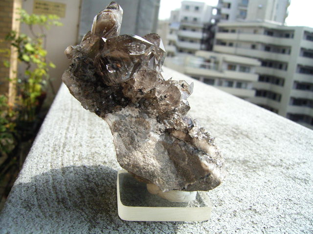 手のひらの上には画像のように乗るのですが、結晶ウラの母岩の部分がややなだらかになっていて、ゆるい角度で自立します。