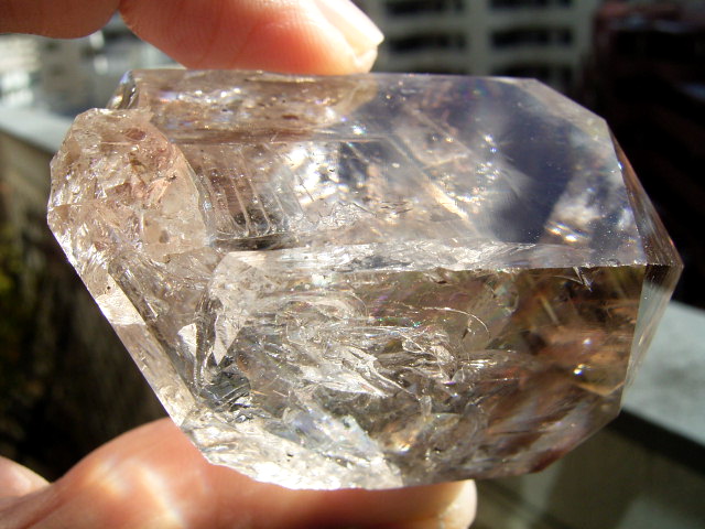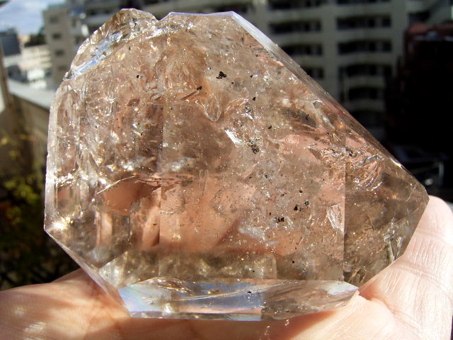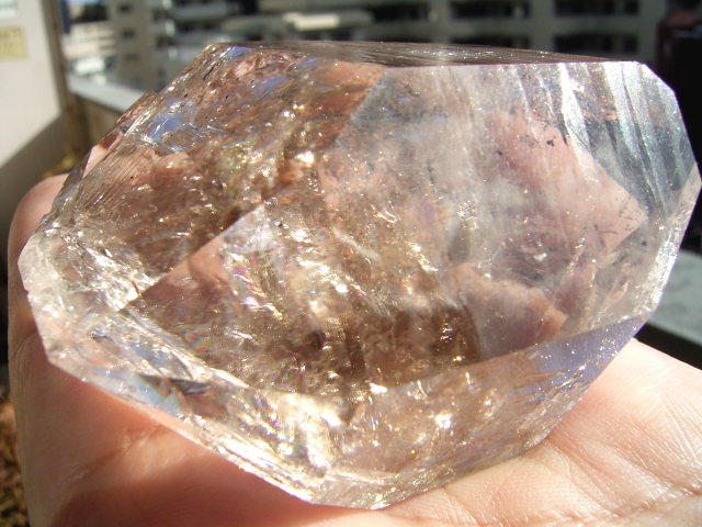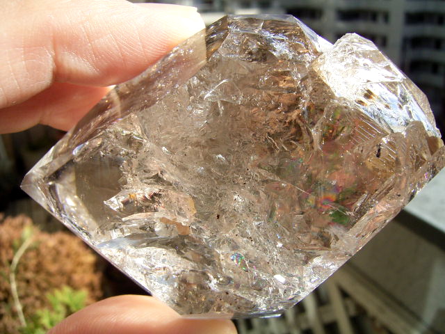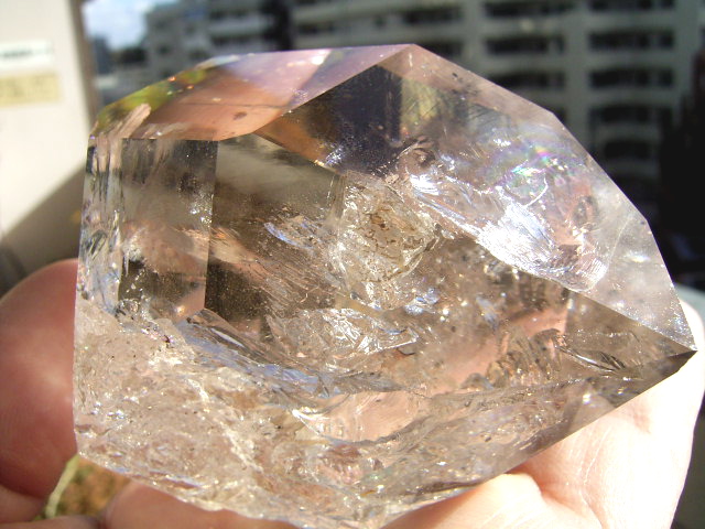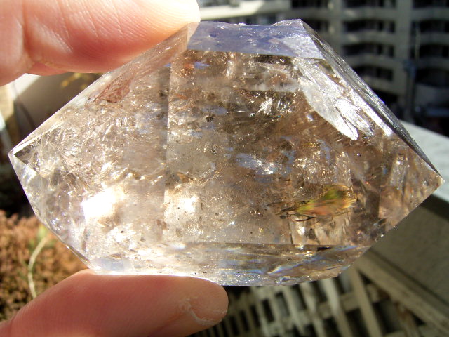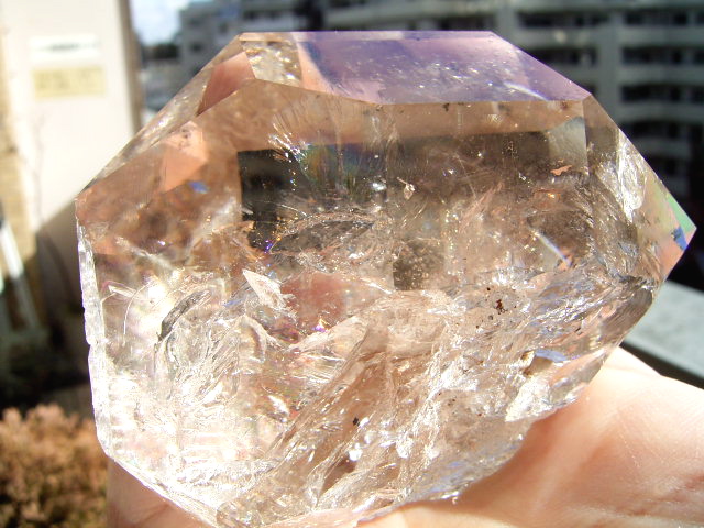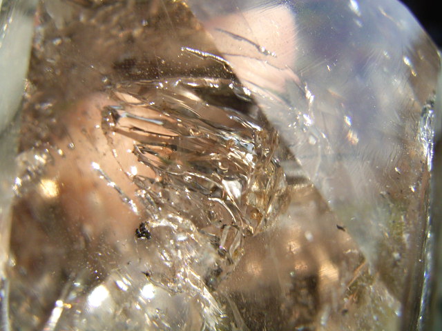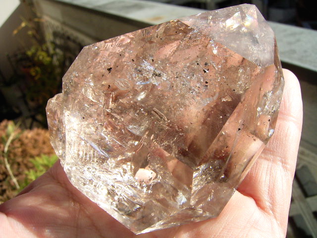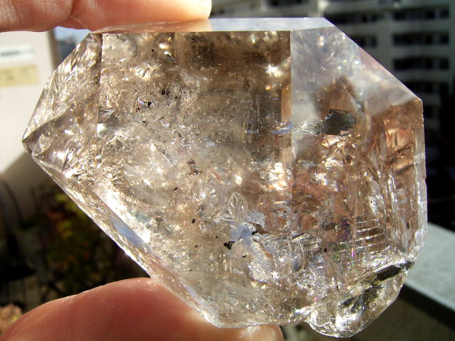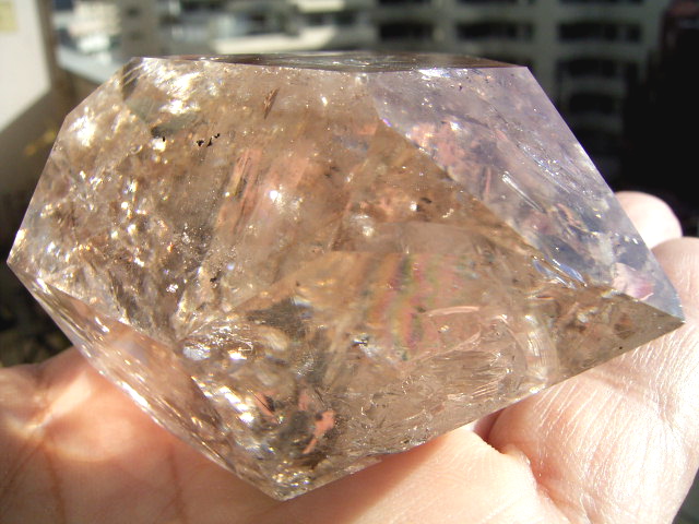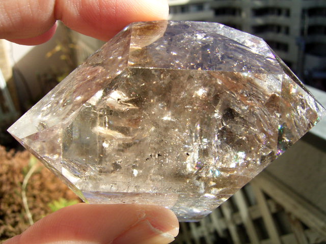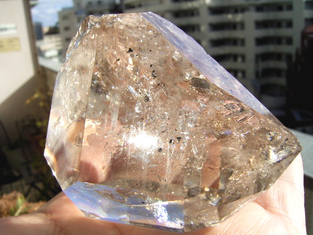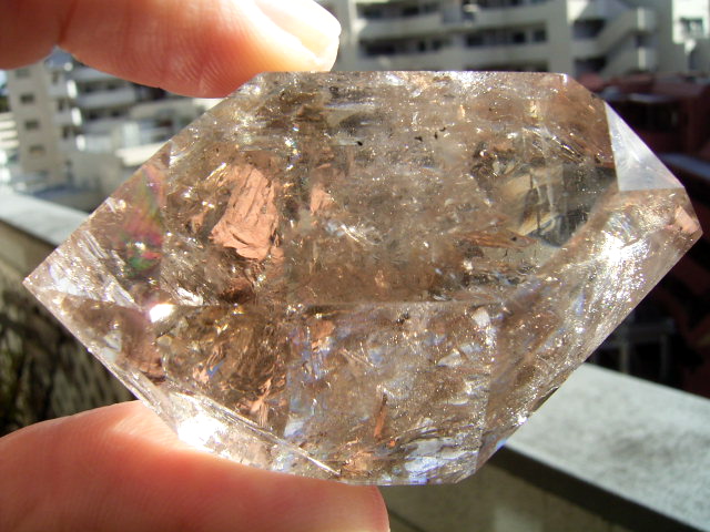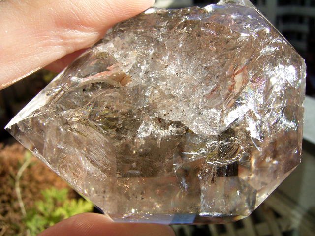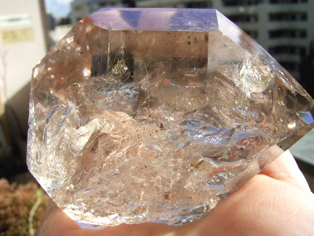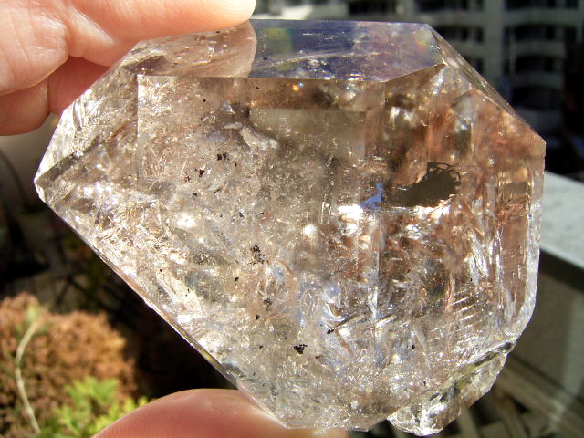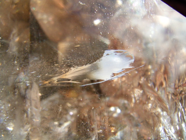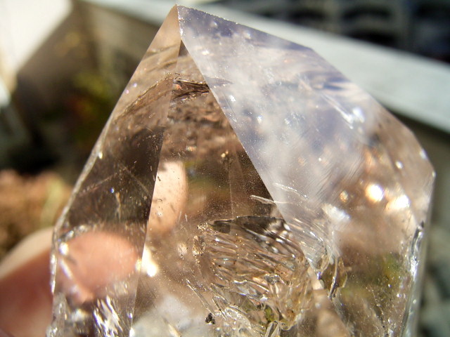 とがった先端側のファセット面の奥に、「部分エレスチャル」気泡があります。