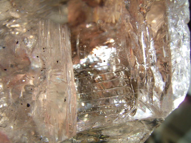 唯一、結晶ヨコの柱面の表面に、45mmほどに渡ってクラスター干渉があります。