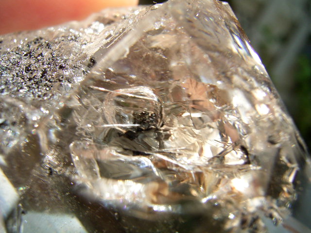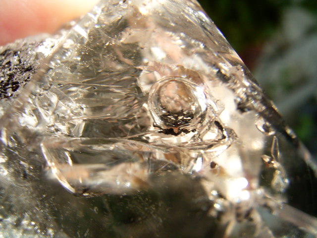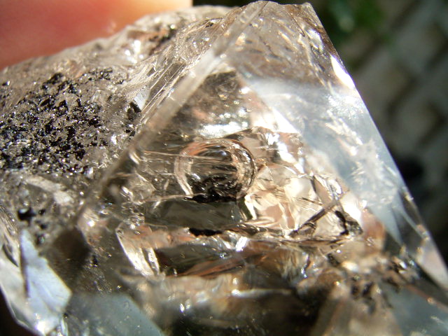 ドリュ母岩貫入ヨコのファセット面に、12mmほどの不定形・長方形の水のポケットがあります。