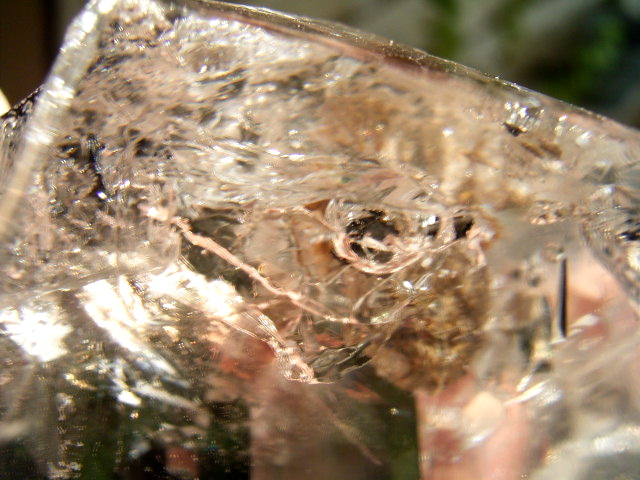 表面は、ご覧の通り。 水入りヨコの柱面に、ドリュ母岩の貫入があって、結晶越しに黄金ドリュのような地肌が覗けます。