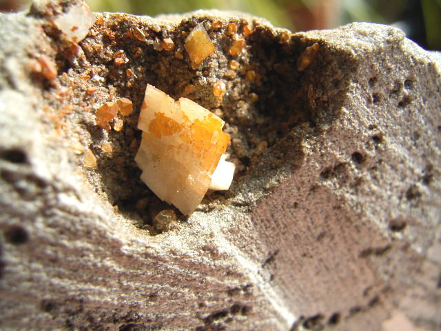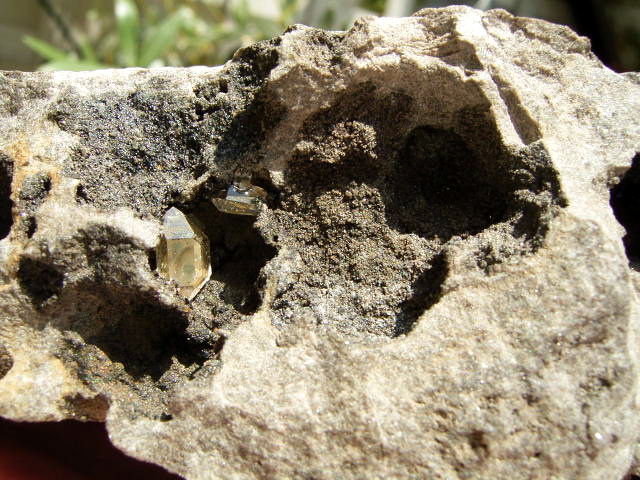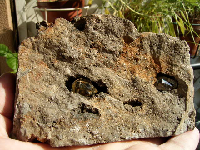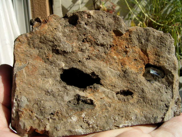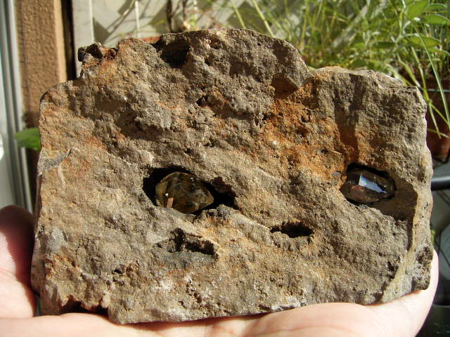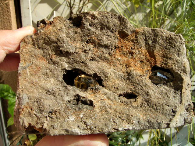 黒いくぼみには、9mm, 5mmの小さな結晶。淡く黄金幕のコーティング。※ルーペで観察してください。