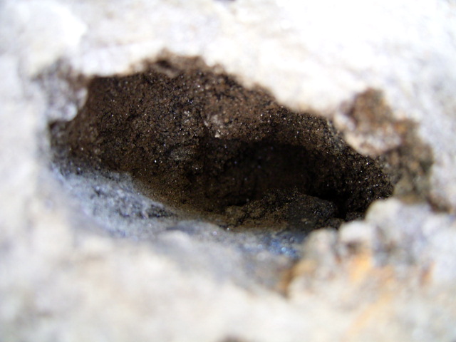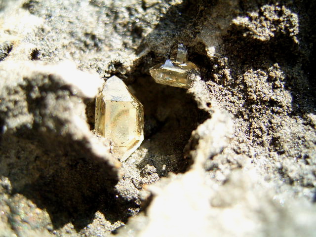 底のヨコの小さなポケットをルーペで覗くと、「黄金ドリュ」がびっしり綺麗に結晶しています。