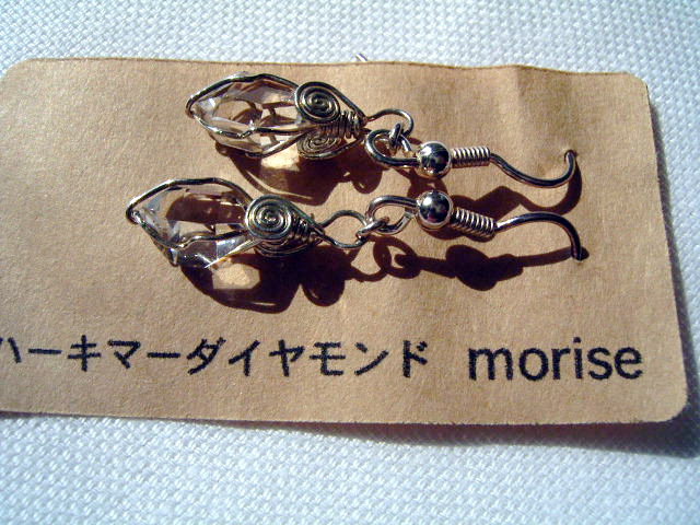 福岡でのマルシェ、「軒先市」「青空市」「ハコイチ」の小さな展示販売会用に、作ってみました。 シンプルラップで可愛いフック式金具の、キュートなピアスです。 石には要件がありますが、ワイヤーで目立たないよう包んでいます。 どうぞ、可愛がって下さい。 …………………………………………………………… 全 長: 35.3×13.5×6.0mm ×ペア 重 量: 5.20カラット×ペア=1.04g×ペア 石 : 10×6.5×5.5mm 10×6.5×5.5mm グレード: AA+(++)〜〜・微細負晶気泡+炭粉・無色透明 AA++・微細クラスター干渉・無色透明 素 材: シルバー925フック式金具(ビーズ付き ) 作 者: nabo 撮 影: Caplio G4(弐号機) ★ 最初の評価額、4,800円でした。 …………………………………………………………… |