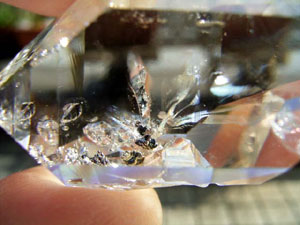 貫入結晶の表面から結晶の内側に向けて、不思議な形の、アシナガ蜂の羽根のような虹の放射幕。