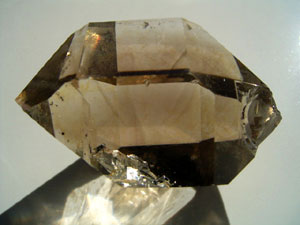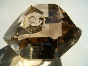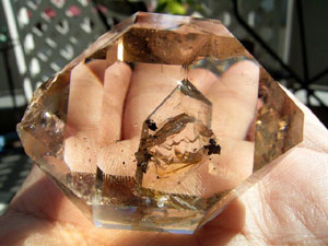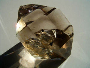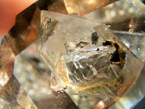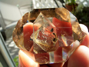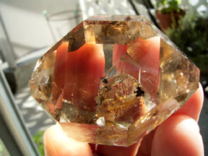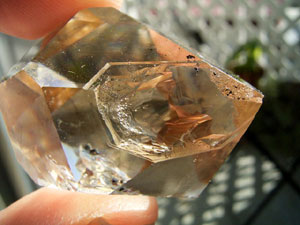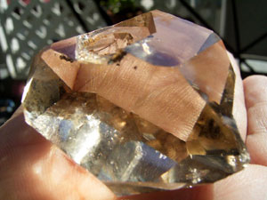 結晶中ほど表面寄りに、素晴らしい「黄金色」に輝くスモークヴェールの幻影・ファントムが形を作っています。