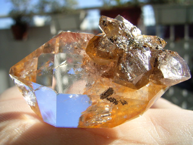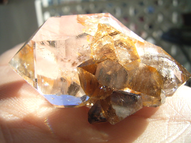 クリアな結晶の片方の剣先に、大きな結晶の種のような幻影があって、そこに同じような黄金色の幻影結晶が7つも集まっています。