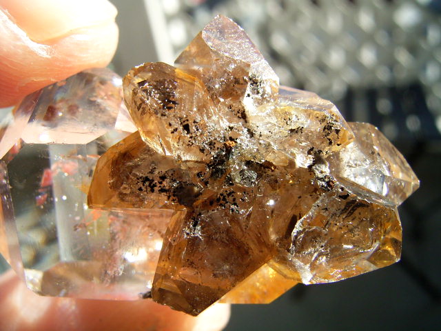 黄金色に染まったクラスターと、クラスター面から面クラックに入り込んだ鉄分が、この結晶も黄金色に染めています。