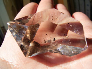 結晶の中央部は結晶の形状に無色なのですが、その周囲にはっきりとわかるスモークヴェールの幻影があって…結晶全体を淡くあめ色に染めています。