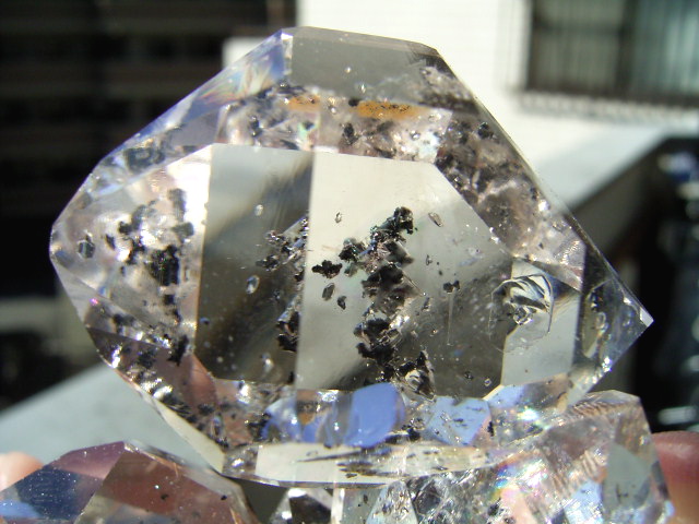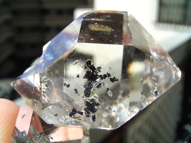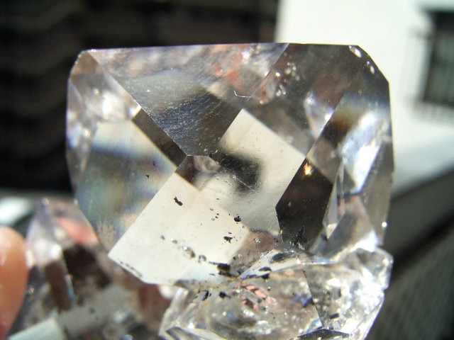 ◆ ヨコの25mmの超クリア結晶の結晶下部には、カーボンとこれまた5mmほどの円形の虹の幕。
