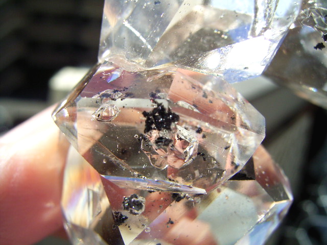 ウラ側のクラスター部分には、微細なカーボン粒・微細な負晶から小さな「水入り」、そして淡い鏡面のヴェールへと続きます。