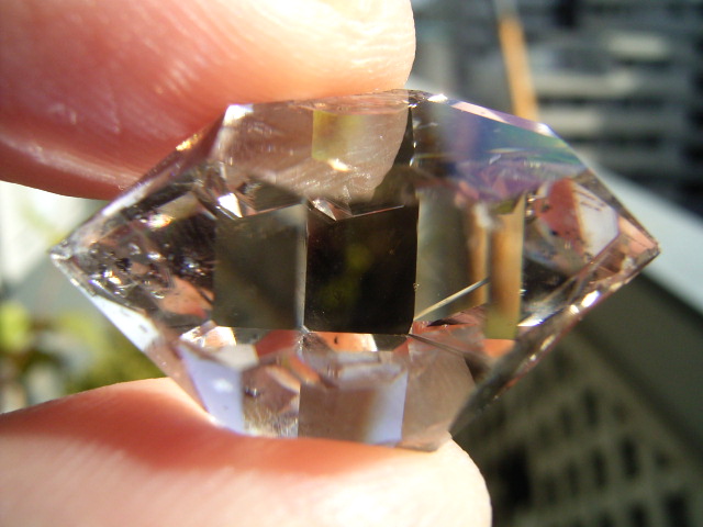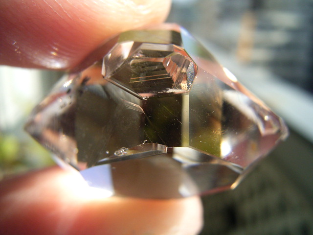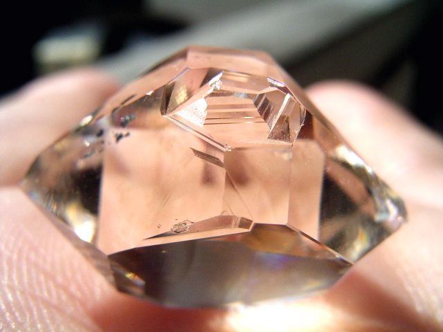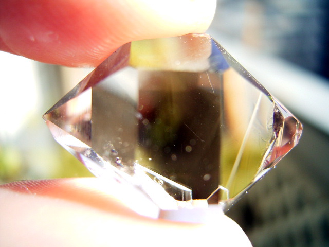 その横のファセット面の先端寄りと、反対側の先端寄りに、淡く酸化鉄の皮膜がかかっていて「コーティングレインボー」が出ています。