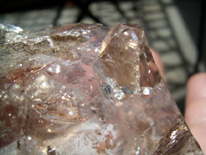 結晶ウラ側に、13mmと17mmほどの透明結晶を飲み込んで、おのおのの貫入の具合が結晶越しに見えています。