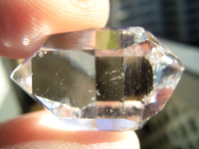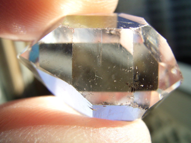わずかに、ファセット面の柱面寄りに、微細カーボン粉が集まったところが1つきり。