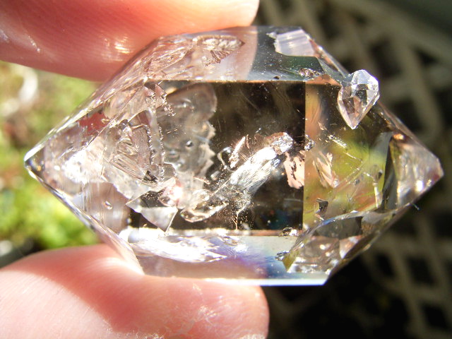 ◆ 結晶ウラ側の奥には、不定形気泡から羽のように2枚の虹のヴェールが広がっています。