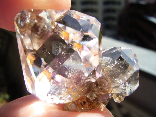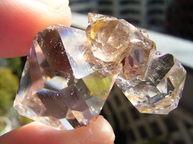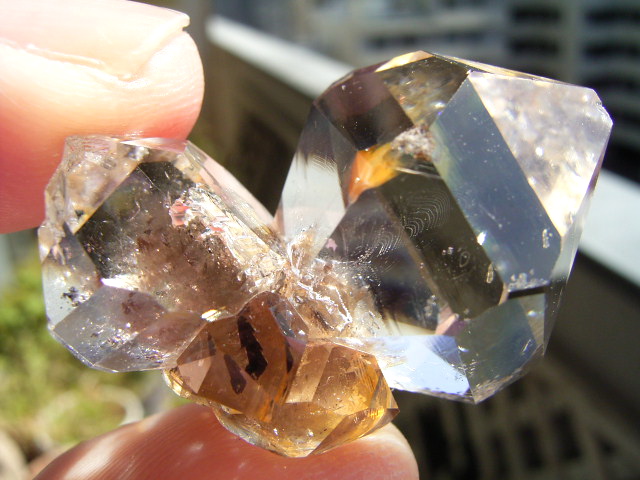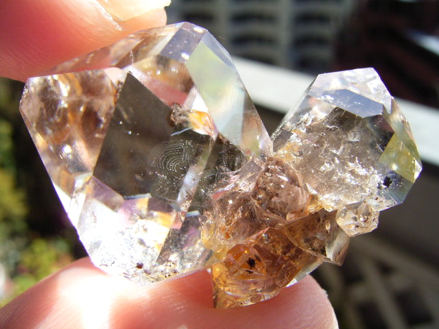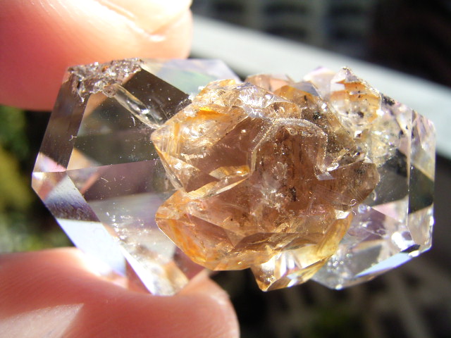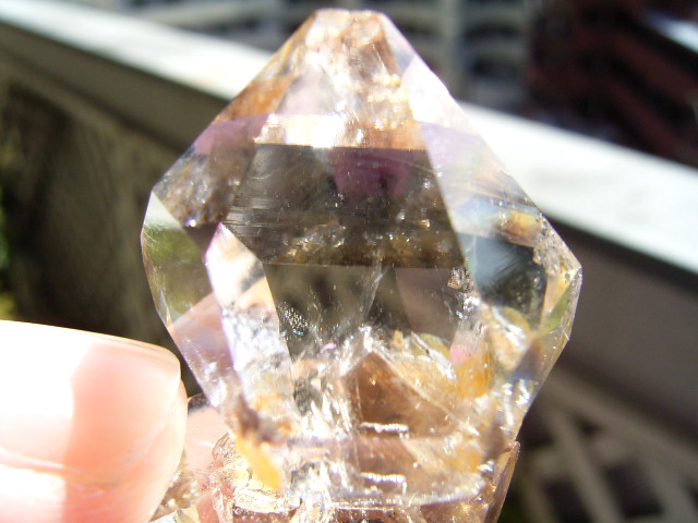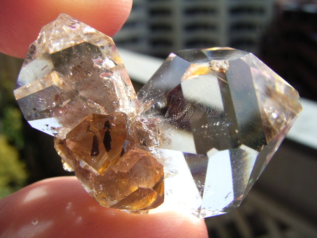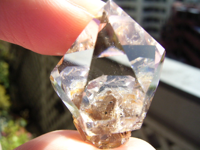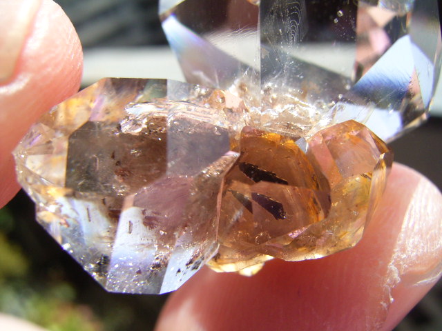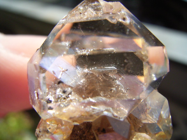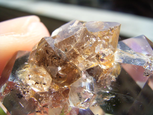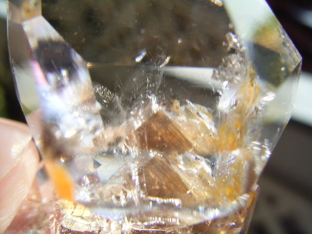 一番大きな21mmの結晶越し、結晶底に、黄金の「ピラミッド」の幻影が沈んでいます。