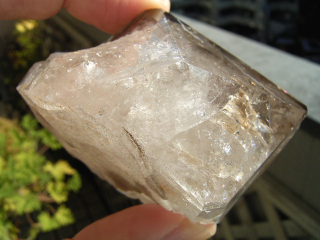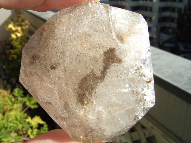 結晶中ほどから下の、柱面寄りの幻影を4分の3周に取り囲むように「面クラック」。(エレスチャル形成の由来だろうか?)