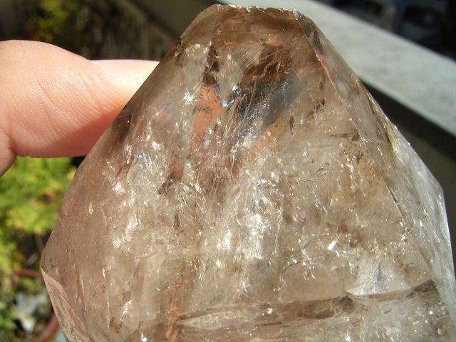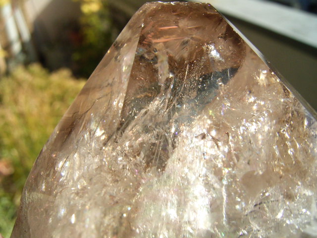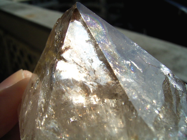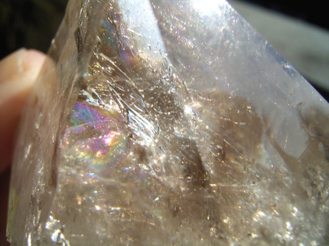 ファセット面の内側から結晶奥にかけて「大きな虹幕」が幾重にも重なって、その奥のクラックに小さく「エレスチャル」の気泡が隠されているようです。