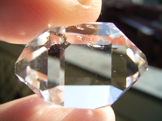 ファセット面のエッジの上に、1mmと2mmほどの四角っぽい微細クラスター干渉。