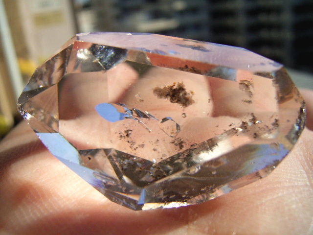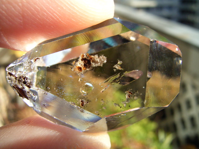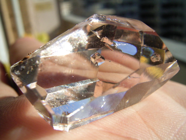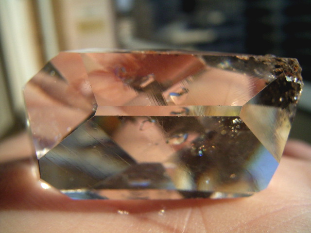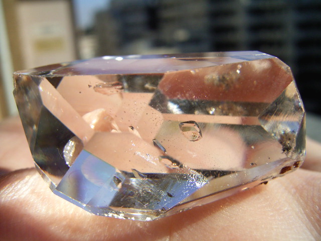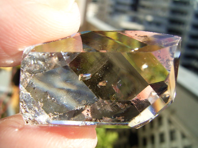 大きなファセット面が平行にあって、結晶をヨコから見ると、14.3mmの分厚いガラスの角柱に見えます。