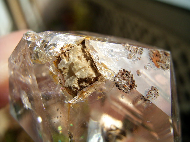 すぐ横に、不定形気泡、その先に5mmほどのやや白っぽい結晶内包があって、貫入虹が出ています。