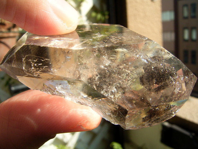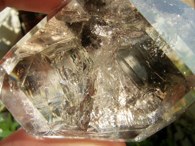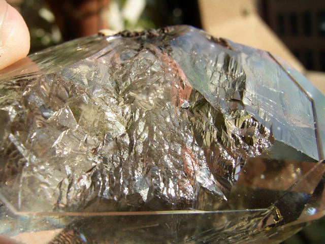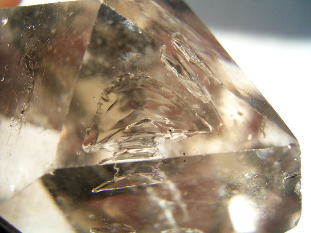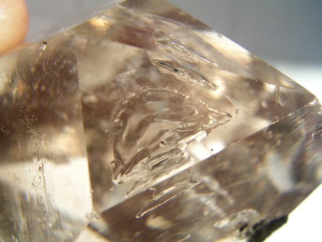 ◆ さらにその先に、淡いスモークの山型の幻影があって、結晶を淡く「超クリアスモーク」に染めています。