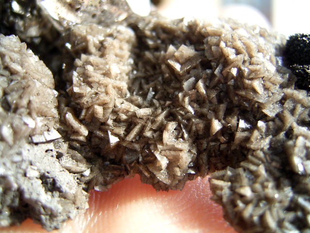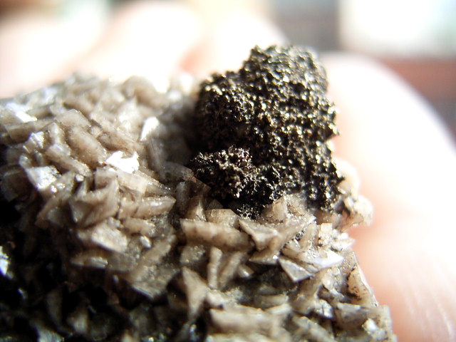 ドロマイト母岩の端に黒く見えるのは、微細パイライト結晶が数百個集まった、かたまりです。