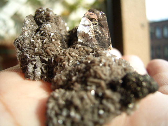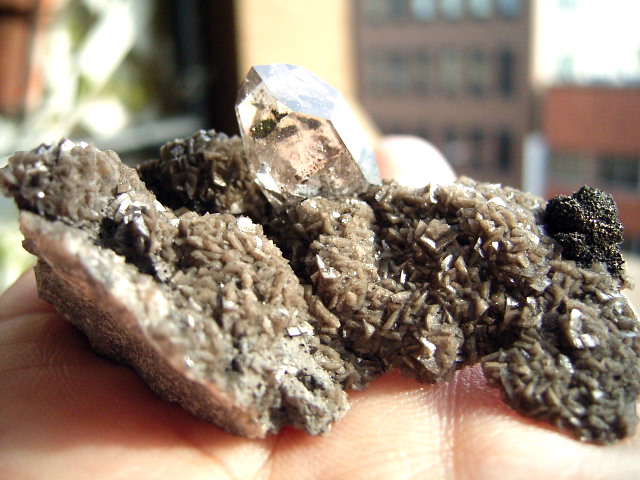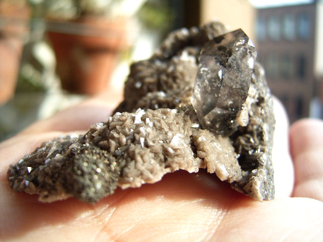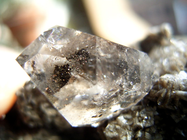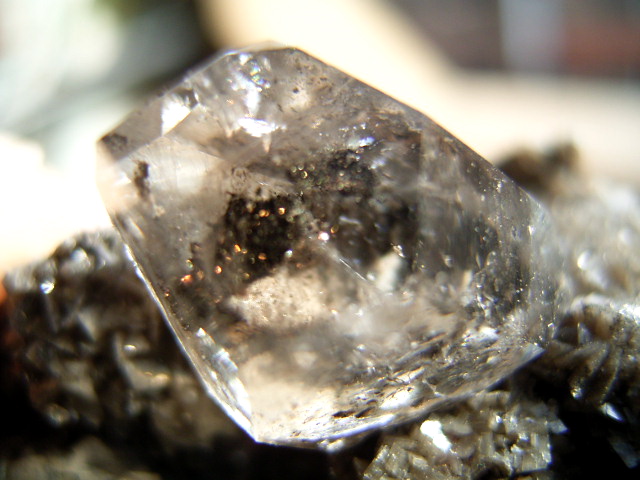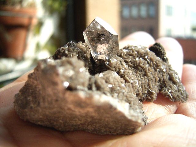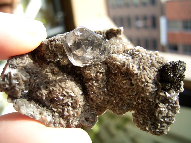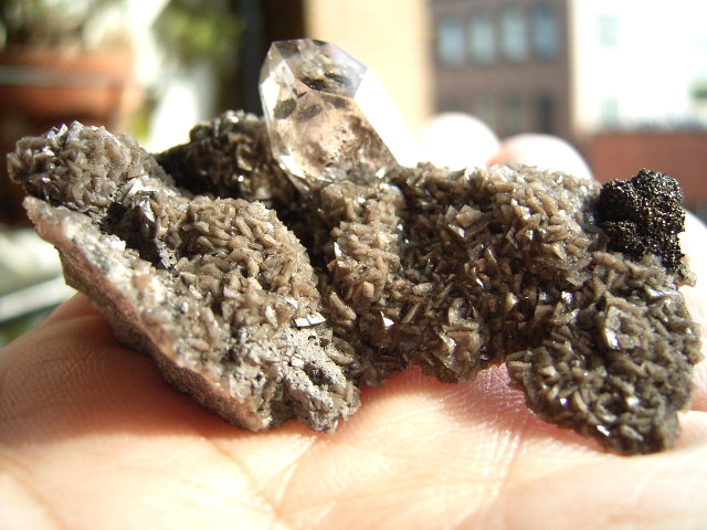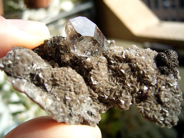 通常はドロマイト成分の入った「ドロストーン」と呼ばれる、砂岩が高温高圧で固まった岩場の凹みが母岩となりますが、 鉱物研究家の堀先生がハーキマーの説明の折に言われている「ドロマイト母岩」の綺麗な標本が出てきました。
