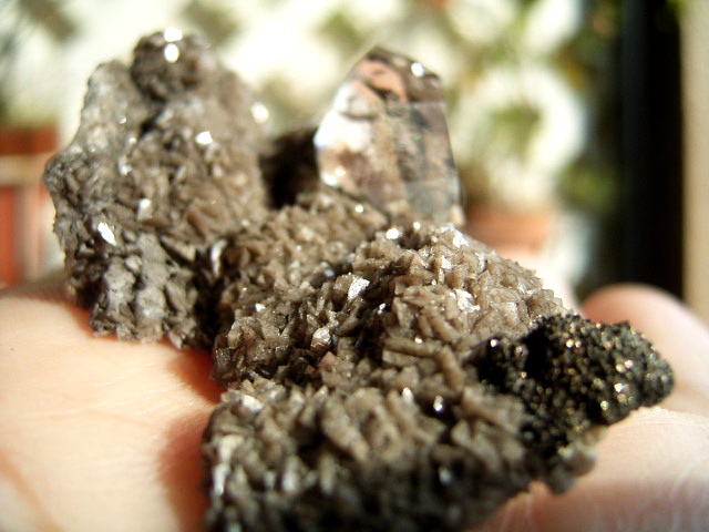その内部にぽつぽつ点で光って見えるのは、パイライト結晶です。