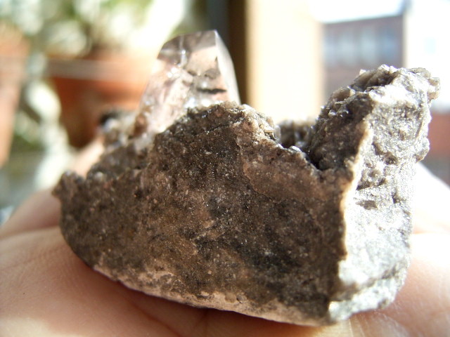 この結晶より向こう側の母岩の壁面は、極微細ななだらかな石英質。