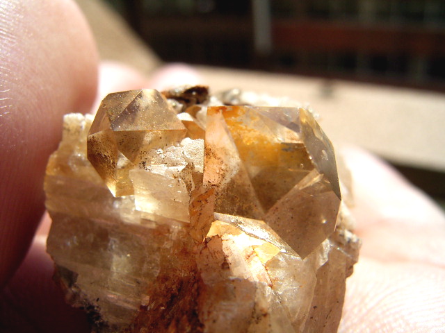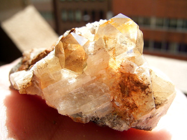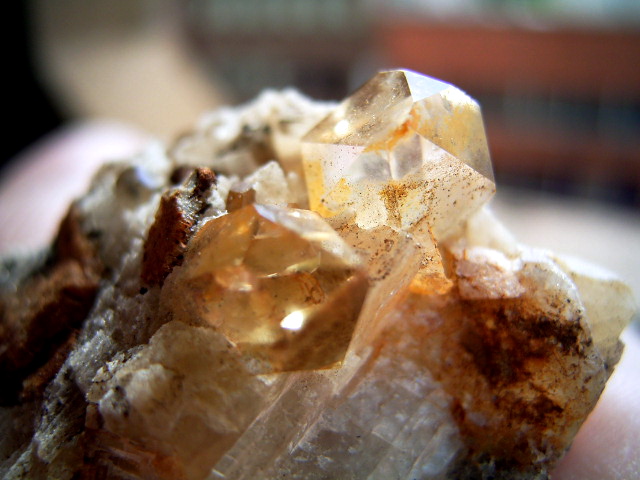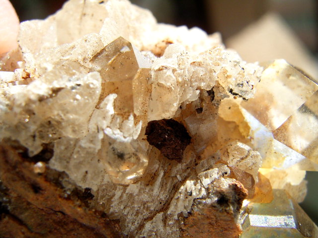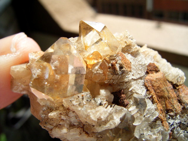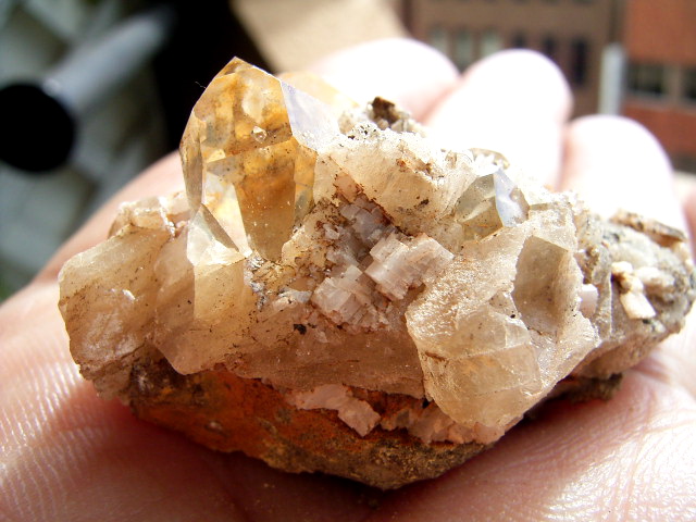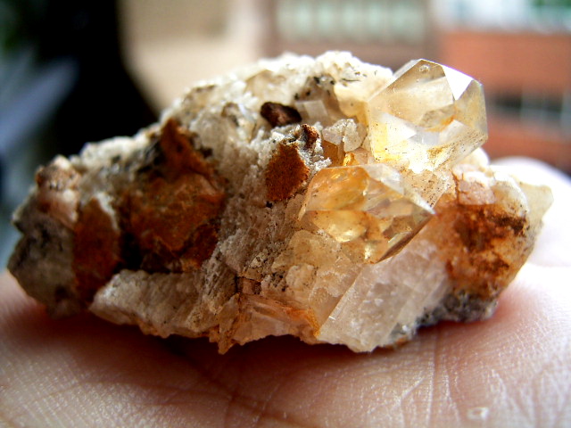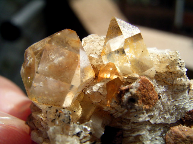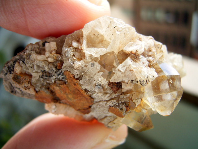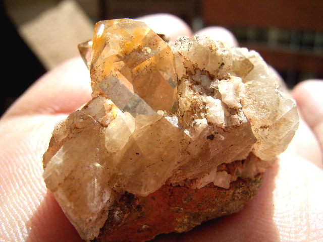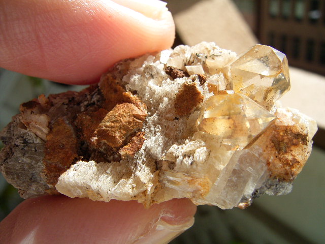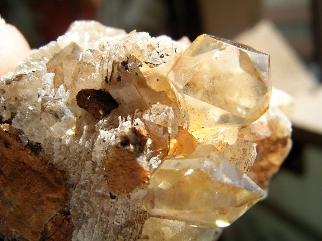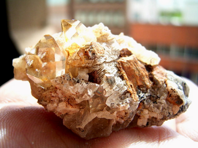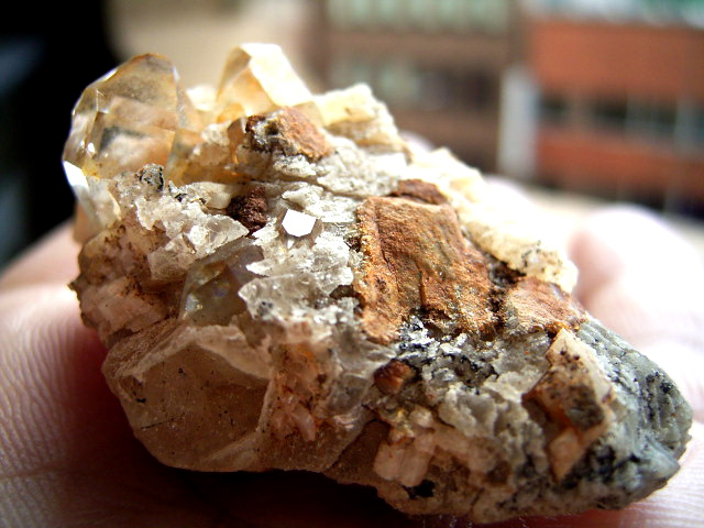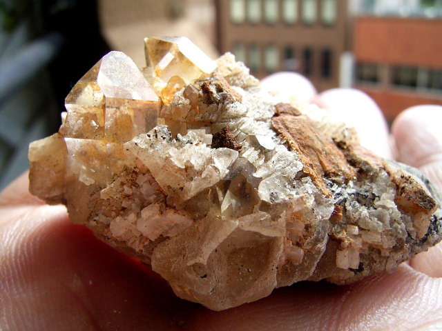 ハーキマーの母岩に、カルサイトとドロマイトと黄金結晶の混成形成です。