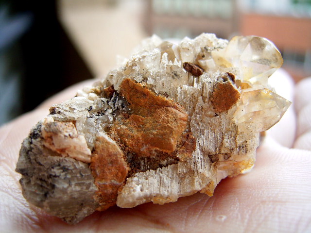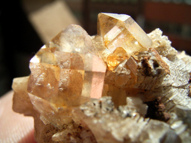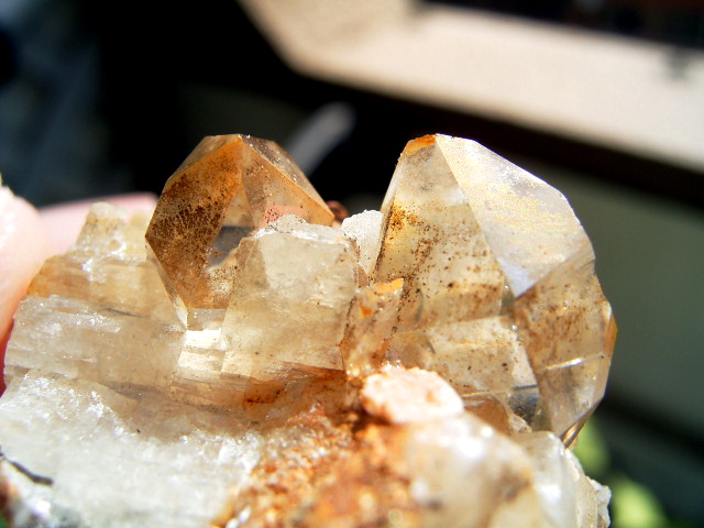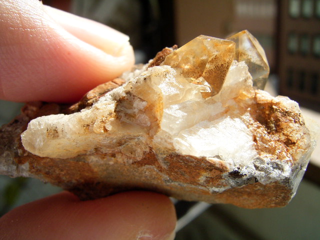 ハーキマーダイヤモンドの母岩は「ドロストーン」と呼ばれるドロマイト成分の入った砂岩が、高温高圧で固まったものだと言われていますが、この標本は、それにさらにカルサイトとドロマイトがくっつき、ハーキマー結晶までも飲み込んだ珍しい標本です。