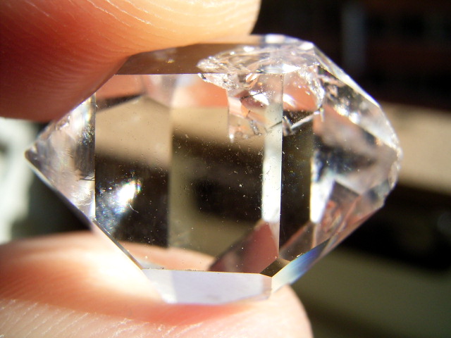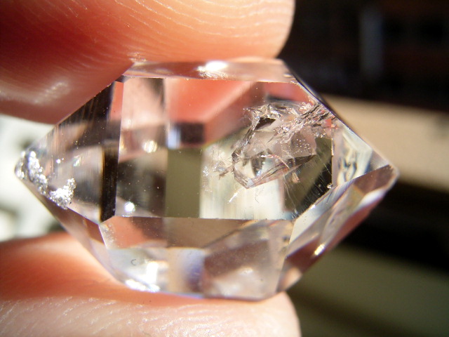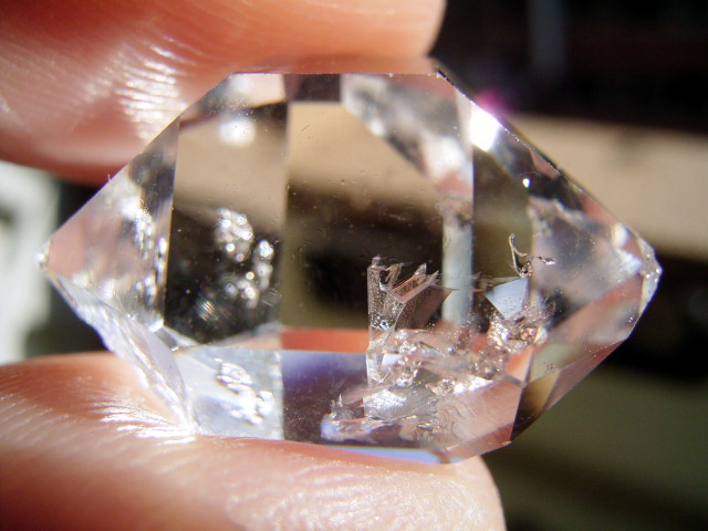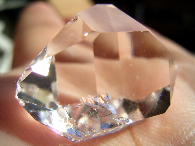 画像のとおり、柱面ファセット面のエッジの下に、5mmほどの超クリア結晶を内包しています。