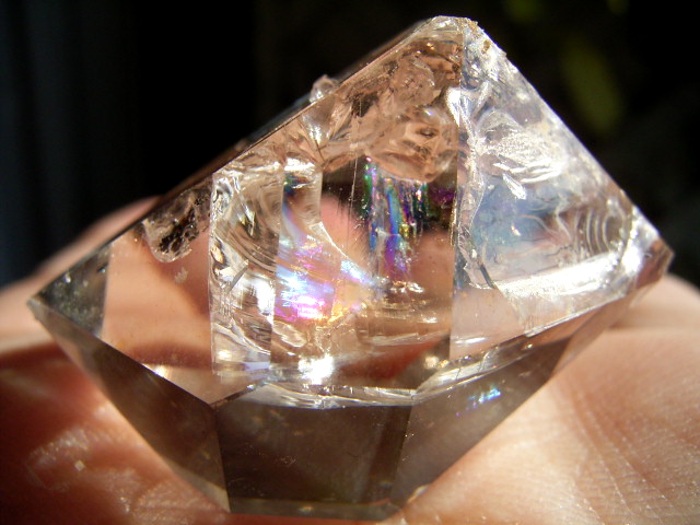 エレスチャルの気泡由来の大きな面クラックから、大きく虹が出て、まさに鑑賞向きのプレミア結晶です。