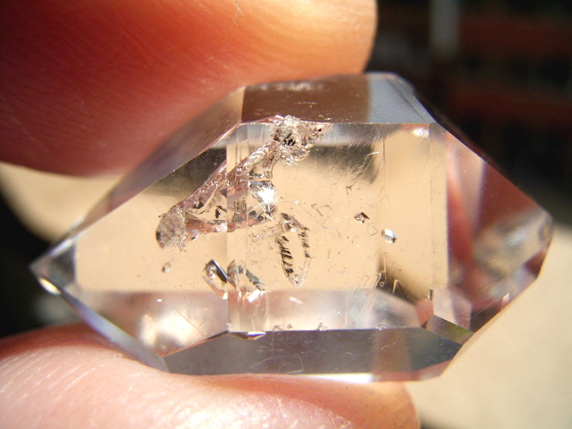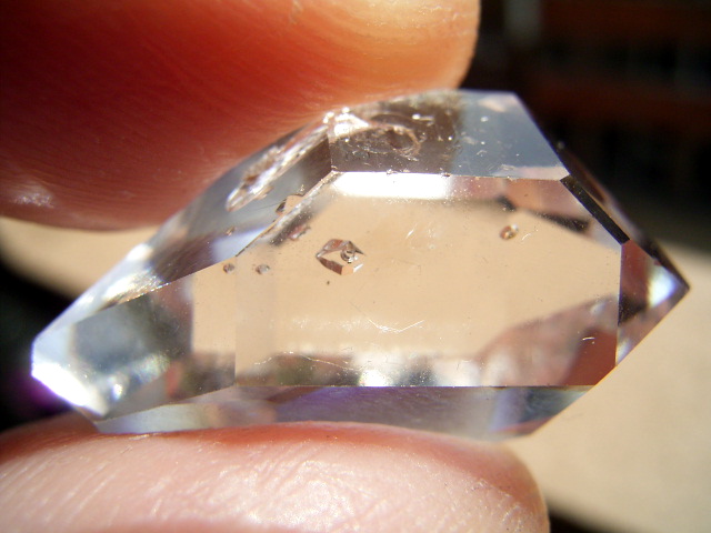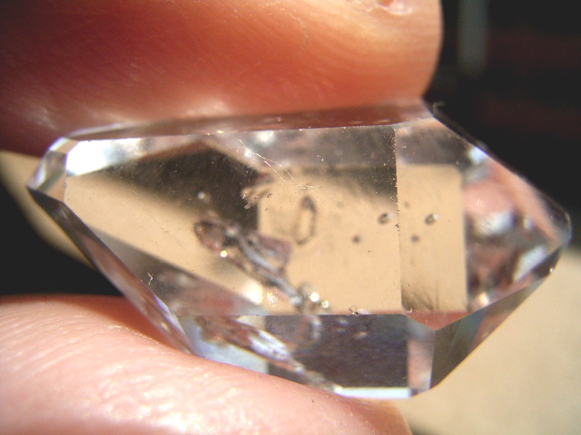 ■ そのすぐヨコの柱面の表面下とファセット面の奥に、2mmほどの結晶の形をした水のポケットがあって、中で0.5mmほどの小さな気泡がすいすい泳いでいます。