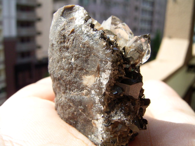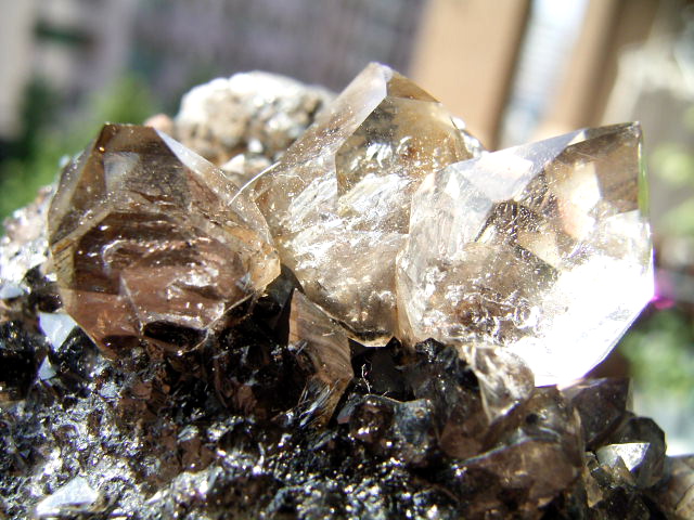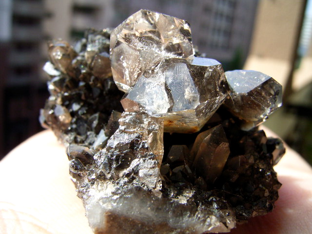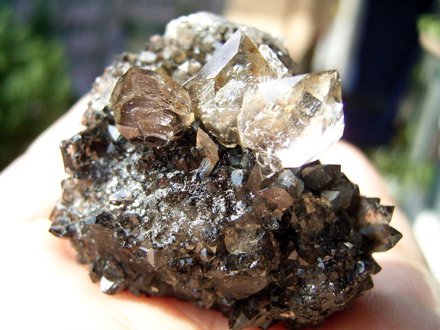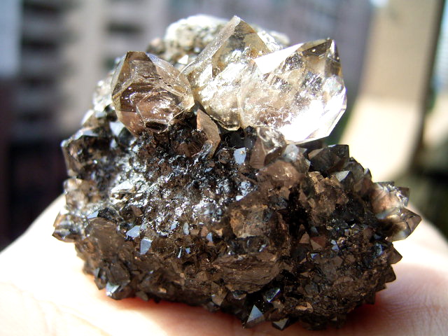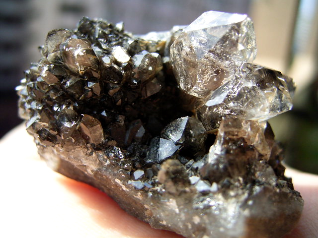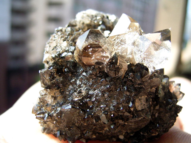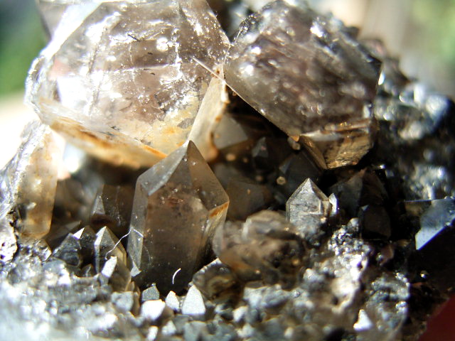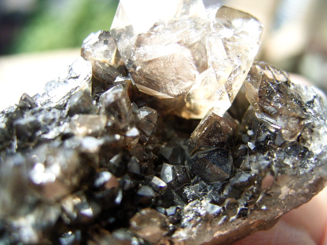 いろいろなファントム結晶、ダークスモークの絡み合った双晶・群晶、真っ黒な幻影結晶達が、重なり合って形成されています。