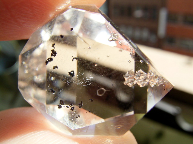 ファセット面の表面下に、円形のようなカーボン粉と粒の集まりがあって、その奥に淡い幻影がうっすら。