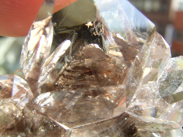 結晶ウラの小さなクラスター結晶の集まりのヨコ、真ん中の最大結晶のウラに、淡いクラスター干渉があって、自己修復しています。