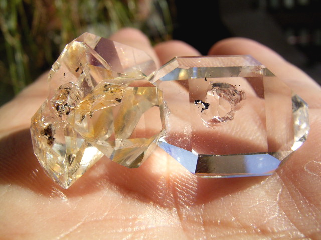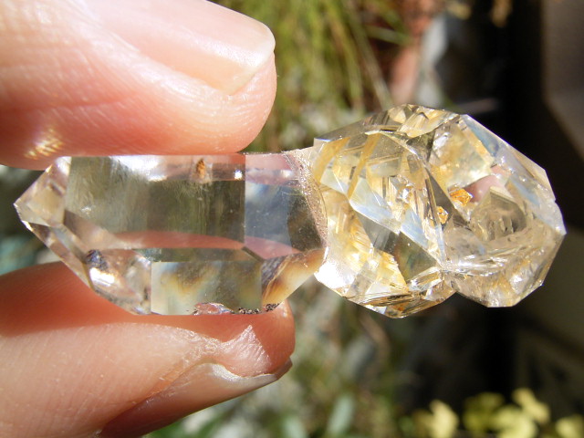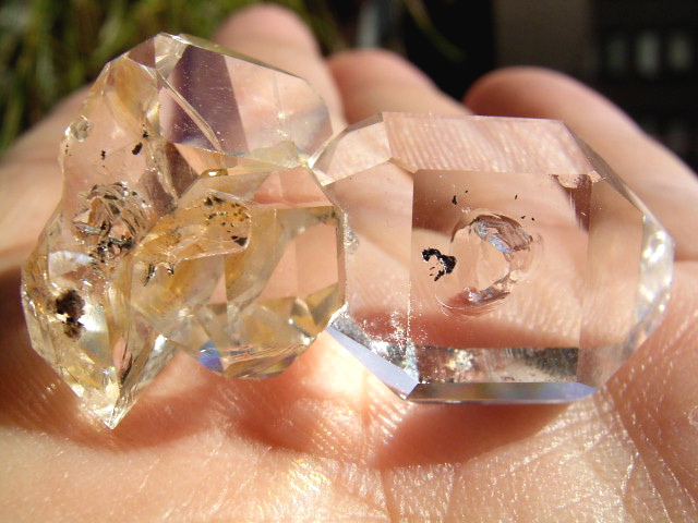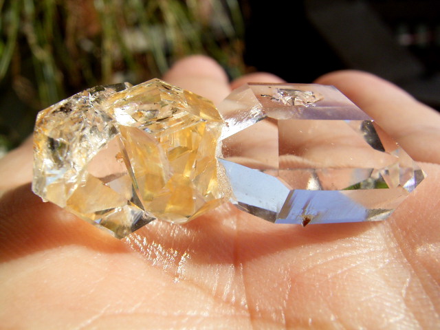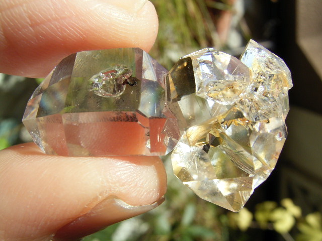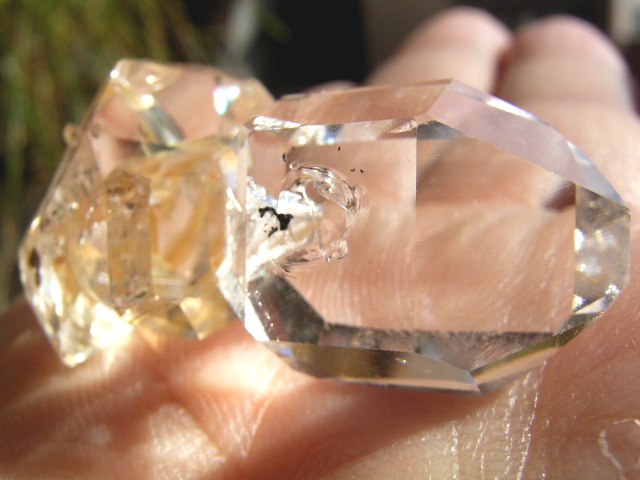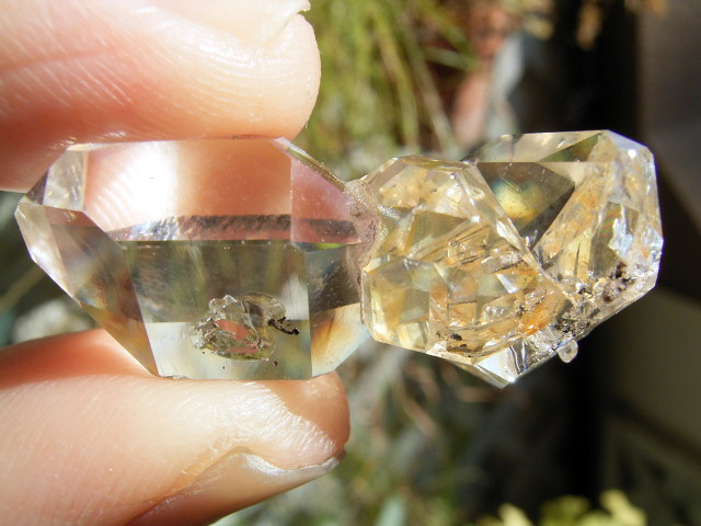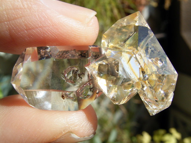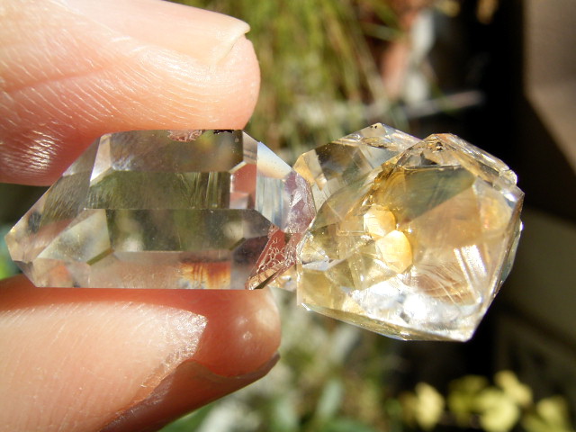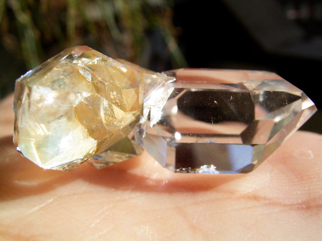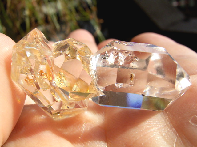 ハーキマーらしい3連結、片や無色透明、片や淡いゴールドで、クリアさ加減はハンパではありません。