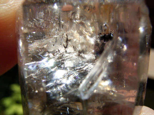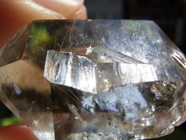 結晶を斜めに横断する「大鏡面の銀河」と虹のある小さな鏡面ヴェール。※ルーペで見ると、微細な虹もキラキラ。