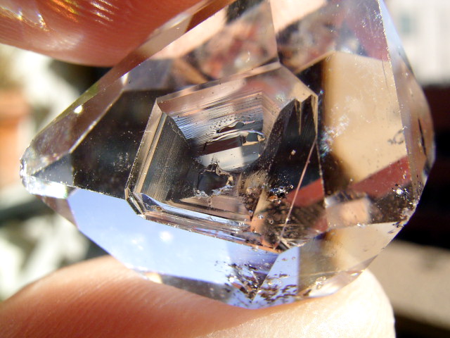 その横、となりの柱面と横のファセット面の表面下に、微細なカーボン粉の集まりと微細負晶の銀河が少々。