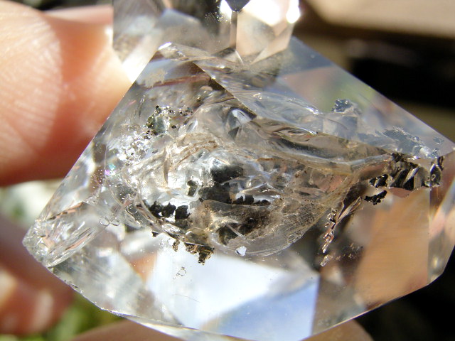 結晶内部は「プレミアムレア」、淡幻影+不定形気泡に炭粒の動く「水なし」+微細虹幕と美貫入虹。