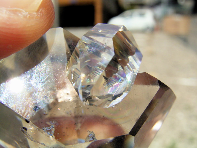 まずは、貫入結晶の貫入面に、階段放射状のキラキラした虹が、とてもきれいに出ています。