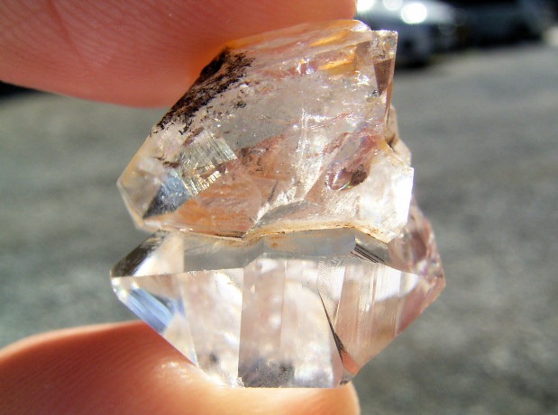 ■ しっかりした大粒クリア結晶が、かみ合うようにくっついた、ハーキマーらしい透明双晶です。