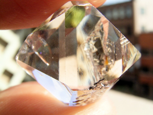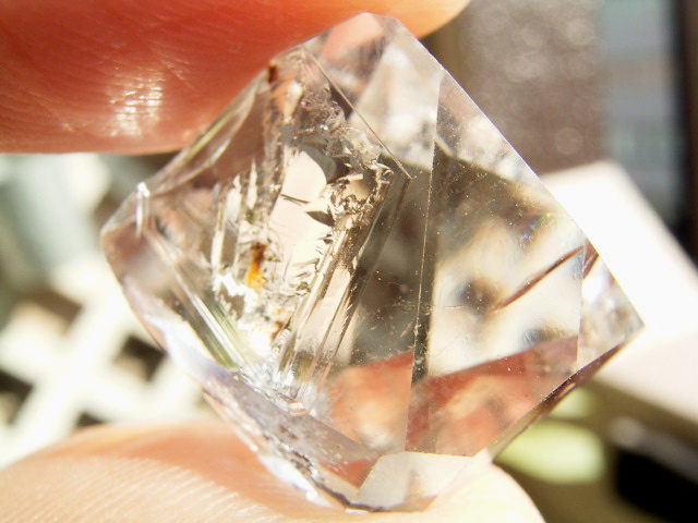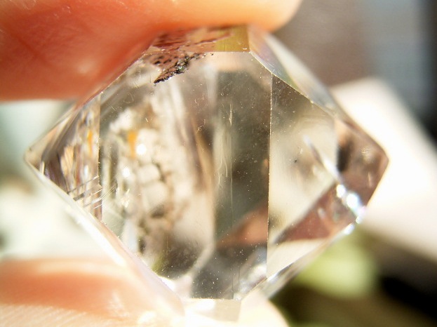 大きなファセット面の下に、薄く曲がった気泡が「小さな虹ヴェール」になっています。